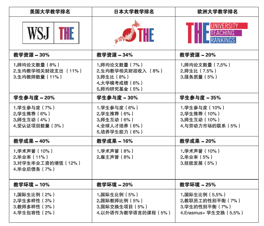 美国、日本和欧洲教学排名的评估体系尽管维度相同,但是在不同区域使用了不同的二级指标,评估的方法做到了本地化。例如,学生参与度维度中,美国教学排名考察了学科的广度,在日本则使用了高中升学顾问调查;教学资源维度中,欧洲教学排名考察了服务质量,美国和日本则没用这个指标。
