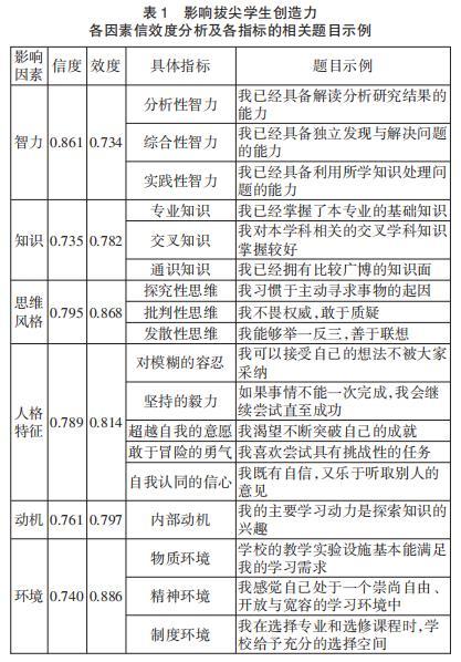 本研究按照测量研究的范式,通过拔尖学生自评方式测量拔尖学生的智力、知识、思维风格、人格特征、动机和环境状况与创造力表现,探究拔尖学生创造力发展的作用机制。对拔尖学生创造力发展的测量主要根据员工创造力量表改编成拔尖学生创造力问卷。问卷包括四部分:第一部分为拔尖学生基本信息(性别、年级、专业和学校);第二部分为拔尖学生创造力发展测量题目;第三部分为影响拔尖学生创造力发展因素测量题目;第四部分为拔尖学生院校满意度测量题目。运用克伦巴赫 (Cronbach’s alpha)信度系数来估计问卷的内部一致性信度,结果表明问卷总体的信度系数是0.888,对各个分问卷计算克伦巴赫信度系数,均达到α>0.7的标准,说明问卷信度良好,各部分题项设计合理,测量工具的一致性和稳定性较高。采用探索性因素分析的正交方差最大法进行主成分分析,以检验问卷的结构效度。结果表明,问卷的KMO系数值是0.914,对各个分问卷计算 KMO系数均大于0.7,Bartlett球度检验概率值是0.000,小于0.05的标准,表明问卷适合做因素分析,问卷各部分题项设计合理,效度良好。其中,影响拔尖学生创造力各因素信效度及各指标的相关题目示例见表1。