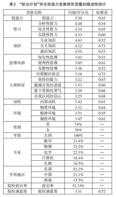 本研究中拔尖学生创造力发展为因变量,拔尖学生的智力、知识、思维风格、人格特征、动机和环境状况为自变量。学生的性别、年级、专业、学校为控制变量,其中,男生542人,女生190人,“拔尖计划”入选学生男生占比较高,各个专业上人数分布差异不大。在学校地区分布上以东部地区高校居多,这和我国东部优质教育资源集聚有关。所有变量的描述性统计结果见表2。