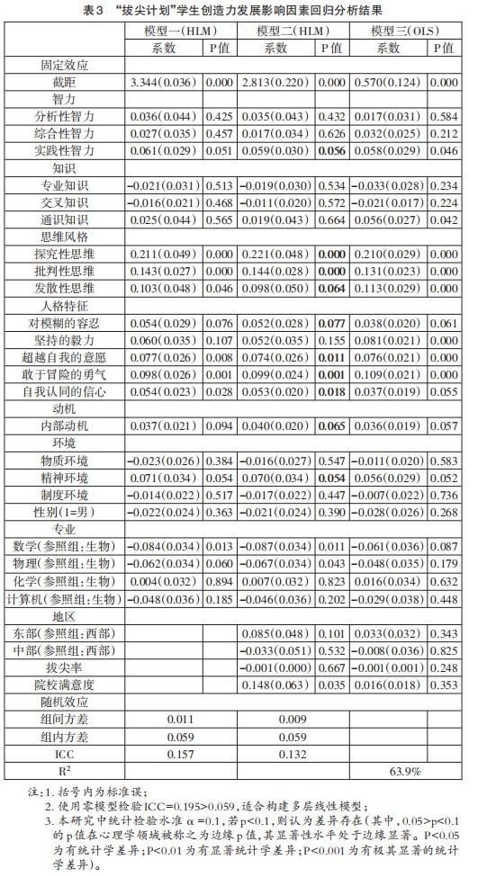 根据设立的两层线性模型将影响拔尖学生创造力发展的因素放入模型,得到两个模型。其中,模型一仅仅将影响拔尖学生创造力发展的个体层面因素智力、知识、思维风格、人格特征、动机、环境和学生的性别及专业投入模型,模型二则是在模型一的基础上,将影响拔尖学生创造力发展的学校层面因素学校所在地区、学校的拔尖率和院校满意度投入模型。模型三则是普通的多元线性回归模型。所以,相比模型一和模型三,模型二将影响拔尖学生创造力发展的个体层面和学校层面的因素都投入了模型,很好地控制了学校层面因素对拔尖学生创造力发展的影响,研究结果更具说服力,结果分析部分将主要使用模型二的数据,具体的数据分析结果见表3。