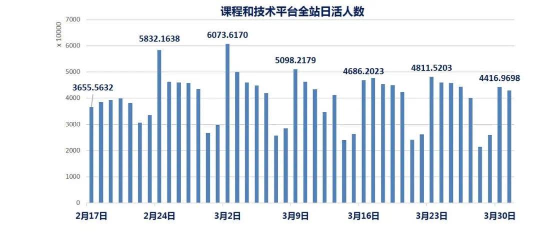 高等教育司迅速组织37 家基础好、实力强的在线课程平台和技术平台(见表1),率先向全国高校免费开放4.1 万门慕课和虚拟仿真实验课等在线课程,带动110 余家社会和高校课程在线平台积极参与。爱课程(中国大学MOOC)、学堂在线、智慧树、人卫慕课、好大学在线和华文慕课等,表现非常出色。疫情期间,各种平台除了此前提供的课程外,新增慕课达5000门。为教师开设的在线教学技术、方法等方面的培训大幅增加,参与培训的师资新增394万人次。提供其他形式的在线课程达18400门(见图1)。丰富多彩的各类教学资源,有力支撑了高等教育在线教学工作的顺利开展。以教育部首批和第二批公布的37个课程和技术平台为例, 2月17日、2月24日、3月2日这几个开学高峰日平台日活跃人数在3600多万人次到6000多万人次之间,之后稳定在5000万人次左右(见图2),这些都是天文数字。这37个平台,外加其他多个平台,保证了教学工作的顺利开展。虽然运行过程中也遇到过一些网络卡顿和拥堵,但经过迅速调整,很快便都恢复正常运行。