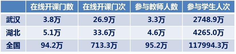 表2 武汉、湖北及全国在线开课情况与参与师生情况