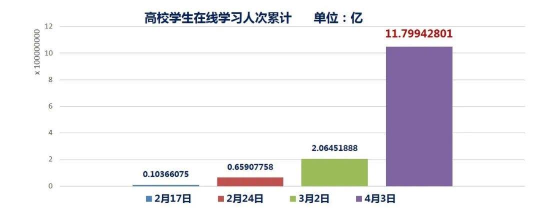 经过大量的数据监测和分析,我们取得了两个重要成果。第一,在线教学实现了“三稳”,即稳住了武汉高校,稳住了湖北高校,稳住了全国高校。全国高校都实现了平稳的在线开学,学生开始进行正常的学习,教师开始进行正常的教学,学校开始进行正常的管理工作。从4月3日的数据可以看出,武汉高校共开出3.8万门在线课程,湖北共开出5.1万门在线课程,全国共开出94万门在线课程。参与其中的教师,武汉有3.3万名,湖北有4.6万名,全国有95.2万名,这是了不起的成绩!从2月17日开学第一个高峰日至4月3日,仅47天,在线学习人数累计达到11.8亿人次,实现了110多倍的增长(见表2、图3)。我们真正兑现了“停课不停教、停课不停学”的承诺。
