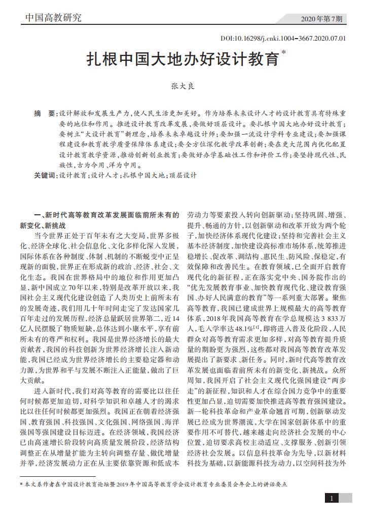 设计与人们的生产、生活、生态密不可分,通俗来讲,设计就是通过创新思维把设想转化为实施的计划。设计解放和发展生产力,设计使人们的生活更加美好,设计改善了人们得以生存的生态环境,设计给人们带来崭新的生活方式。设计无处不在,事事都有设计。回望“大国重器、大国利器”的中国制造和伟大创造,从“两弹一星”到南水北调工程,从高能物理世界一流大科学装置到世界领先的高铁路网,从神舟飞天、蛟龙潜海、到天眼观宇,从北京大兴机场通航到港珠澳大桥通车,都有优秀设计人才付出的汗水心血、做出的重要贡献。作为培养未来设计人才的设计教育具有特殊重要的地位和作用,设计教育不可或缺、无法替代。今天设计教育的水平和人才培养质量将决定未来设计人才的素质和贡献,决定设计的未来。