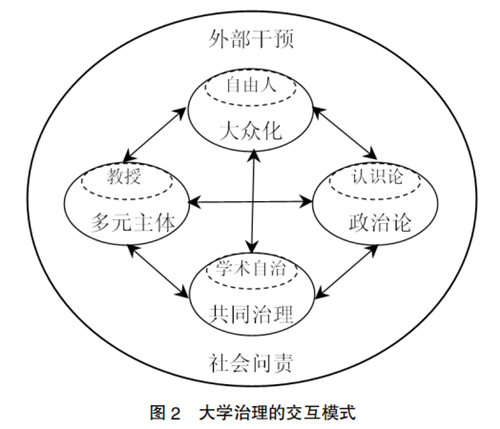 当今时代,深奥复杂的知识已不再是高等教育的全部,高等教育也已不再是极少数“自由人”的特权。因此,认识论哲学成为政治论哲学的一部分,认识论哲学和政治论哲学共同(side by side)发挥作用,学术自治成为共同治理的有机组成,“教授”成为大学多元治理主体中至关重要的一元。同时,上述几个要素之间的关系也不是简单的线性关系,而是互联、互动,相互交流、反馈、作用。另外,大学内部治理也处于外部干预之下,社会问责是高校要始终面对的公众监督。(见图2)