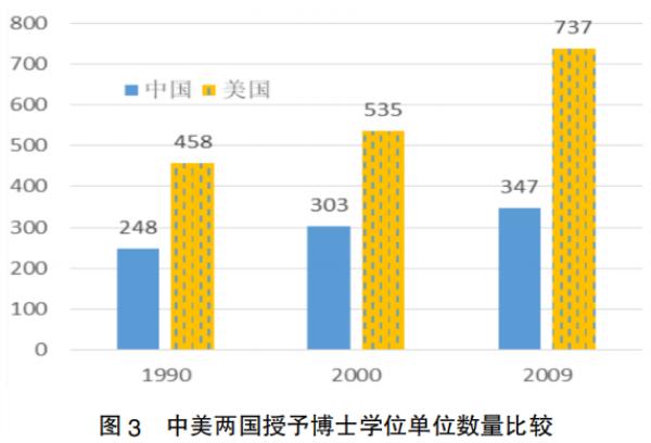 1. 授权单位。1990年、2000年和2009年,我国博士授予高校的数量分别为199所、216所和291所,加上科研院所和党校,博士授予单位的数量分别为248个、303个和347个。因此,我国博士授予单位的数量远远低于美国同期的水平。即使不考虑第一级专业学位的因素,1990年,我国博士学位授予单位数仅为美国的54.15%, 2009年下降到不及美国的一半。(见图3)此后,我国博士学位授权单位数量变化不大,而美国又增加了244个,增幅达到33.11%,两国间的差距进一步拉大。