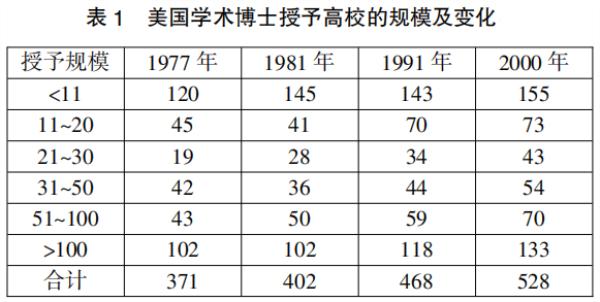 从表1可以看出,2000年美国授予学术博士学位的高校528所,是上述卡内基数据的两倍。其中,43.18%的高校授予学术博士数量在20人及其以下,因而有相当一部分达不到卡内基分类标准的要求,没有被统计在博士学位授予高校之列。