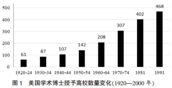 根据Nettles和Millett引用的相关统计数据,到1964年,美国授予学术博士学位的高校就已超过200所;1981年又超过了400所,(见图1)远远高于2000版“卡内基高等教育机构分类”给出的数据。
