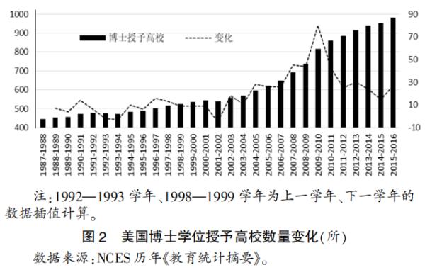 2015—2016学年,美国博士学位授予高校达981所,如果不考虑统计口径变化的因素,与1987—1988学年相比翻了一番多,年均增加19.11所。其间,除了3年之外,都是逐年增加,但增速波动明显。在1988—1989学年至1993—1994学年期间增速较慢,年均增加6.64所;而在2004—2005学年至2008—2009学年期间增速较快,年均增加33.80所,二者相差5.10倍。采用新的统计口径后,2010—2011学年至2015—2016学年,博士学位授予高校增加了164所,年均增加27.33所。