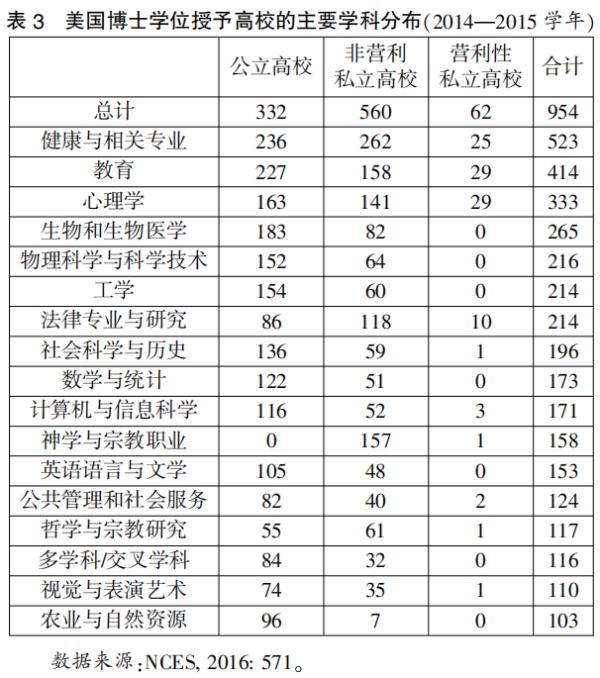 2014—2015学年,在NCES公布的授予博士学位29个学科领域中,有17个学科领域的博士学位授予高校超过百所。(见表3)