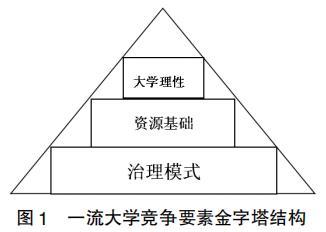 大学理性、物质基础及治理模式这三个要素构成对一流大学建设发生影响的金字塔。(见图1)首先,大学的学术属性决定了其必须是一个自觉自律的理性组织,其行动受制于大学理性且其行动结果很大程度是被大学组织及其成员所持的理性预先决定的。一流大学建设必须以遵循大学办学治校育人的属性及规律为指导,所以大学理性之于一流大学建设中具有置顶的重要性。其次,大学是需要靠消耗大量资源以支撑的贵族型学术组织,对巨大资源的依赖是一流大学建设不可或缺的资源基础,由于资源之于任何一所大学都是有限的并非取之不尽用之不竭,所以即便在西方高等教育强国,一流大学也只能是少数大学的理想和目标。其三,上述两个要素具备后,一流大学能否建成则完全取决于大学的内部治理模式,所以治理模式是一流大学建设底部厚重的不可逾越的操作性基础,对一流大学建设的得失成败具有决定性的作用。