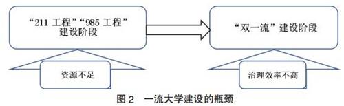 然而,若要在较短的时间内把建成世界一流大学这一仰望星空的理想变为脚踏实地的现实并非易事。如图2所示,笔者把改革开放后40年我国的世界一流大学建设分为两个阶段:第一轮的世界一流大学建设从1998年提出,是“985工程”“211工程”建设阶段;第二轮的世界一流大学建设从2015年开始,是“双一流”建设阶段,两个阶段正好相隔20年。在世界一流大学建设两个阶段的20年间我们都遇到了建设发展中的瓶颈。第一个瓶颈是“985工程”“211工程”期间的“经费短缺”,该阶段我国主要通过加大投入解决一流大学建设的资金困窘问题。但由于长期积淀下来的高等教育投入不足缺口较大,这一轮的世界一流大学建设的经费更多用于整体办学条件的改善;第二个瓶颈是进入“双一流”建设阶段后如何解决“治理效率不高”的问题,因为在制度供给和资源供给的问题都已经得到根本解决的前提下,如果我们的“双一流”建设成效不佳就不能再以制度供给不足、资源不足等外部环境不够好为借口加以推脱。若真是这样,中央高层以“双一流”建设取代“985工程”“211工程”的意义和价值则会受到人们的质疑。