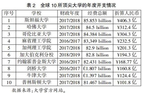 大学理性的问题学界已经讨论很多了,不必赘述。近3年我国在经费预算排名前10位的一流大学建设高校基本呈逐年增加的趋势,至2018年预算最低的武汉大学也达93.5亿元人民币,而清华大学高达269.5亿元人民币。尽管从决算情况看,上述大学都有不同程度的降低,但总体而言,绝大多数大学的预决算都呈逐年增加的趋势,有些大学增速十分惊人。如清华大学2017年的预算比2016年增加了51.1亿元人民币,决算增加了24.99亿元人民币,每年预决算增幅数亿及上10亿元人民币的大学亦非少数。(见表1)为便于与欧美一流大学对照,笔者请熊万曦博士据相关大学官网公布的最新数据,就2018年US. News世界大学综合实力排名前10位大学的年度经费开支情况制作了表2。其中年度开支最高的是斯坦福大学为58.53亿美元(折合人民币 406.3亿元),普林斯顿大学最少为14.67亿美元(折合人民币 101.8亿元)。由此可以得到结论,无论中国还是欧美,凡一流大学无不是强资源依赖型学术组织。