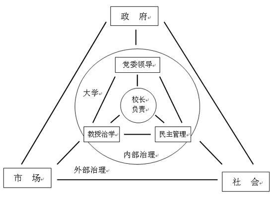 "协调三角形"模式是伯顿·克拉克为解释现代高等教育系统运作,特别是进行多国高等教育体制比较时所使用的经典模式。从治理的视角看,这是一个利益相关者对高等教育的影响体系。受他启发,我们建构了一个由政府主导、大学自主办学、市场竞争配置资源和社会参与评价的治理体系。市场在高等教育治理过程中是不可或缺的。笔者非常赞成范富格特的说法,"我们必须承认这一事实,关于高等教育,具有特质意义的市场并不存在,既不作为一个纯粹的协调形式,也不作为一个单一的现象。""所以,提到高等教育中的市场的概念,最好集中在像市场的要素,最显著的是竞争。"因此,大学、政府、社会、市场构成了高等教育治理体系,这是大学外部治理体系。