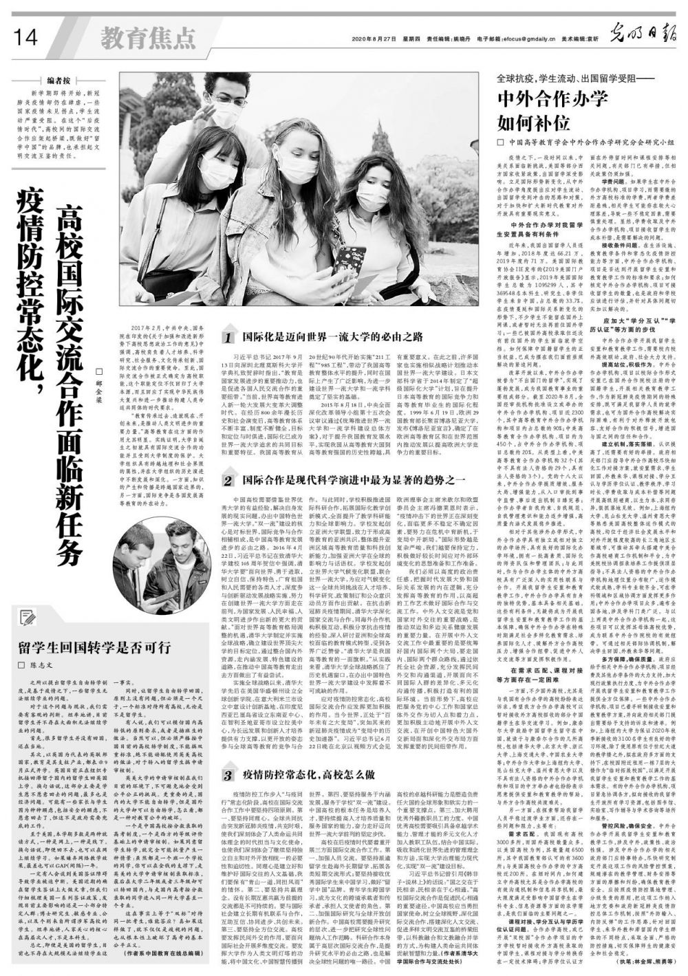 近年来,我国出国留学人员逐年增加,2018年度达66.21万,2019年度约71万。美国国际教育协会IIE发布的《2019美国门户开放报告》显示,2019年美国国际学生总数为1095299人,其中369548名本科生、研究生、非学位学生来自中国,占总数的33.7%。在疫情蔓延和国际关系新变化的形势下,不少学生不能留在国外上网课,或者暂时无法再前往国外学习;一些已被国外高校录取但还没有前往国外的学生面临就学空档。如何保障中国籍留学生的正当权益,已成为摆在我们面前亟须解决的紧迫问题。